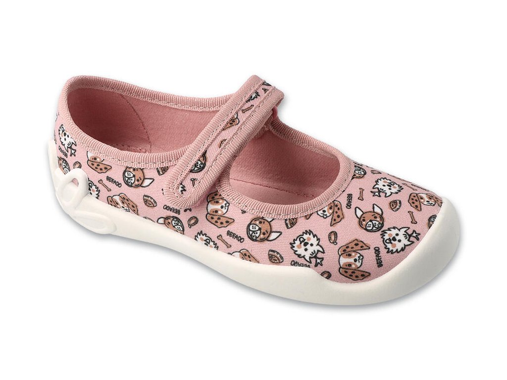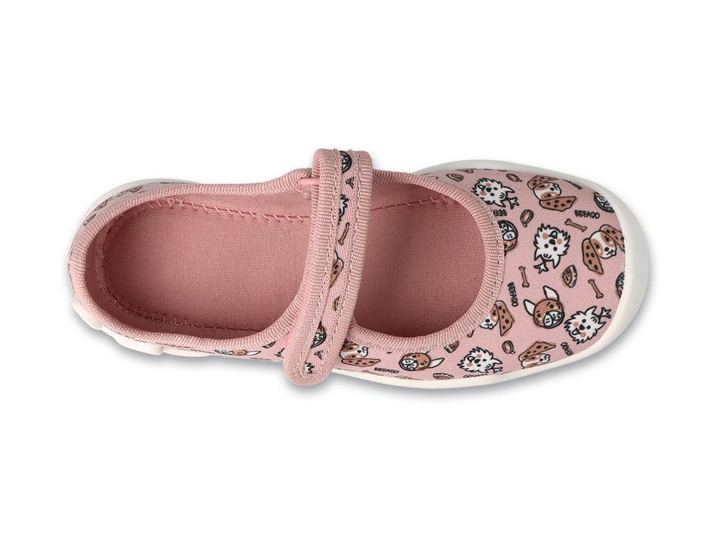 Dívčí balerínky Befado pejsci, zapínání na suchý zip. Pevná pata, pružná a prodyšná podrážka, SOFT-B systém - systém ochrany chodidel - vyměkčená stélka, poskytující zvýšené pohodlí při chůzi.