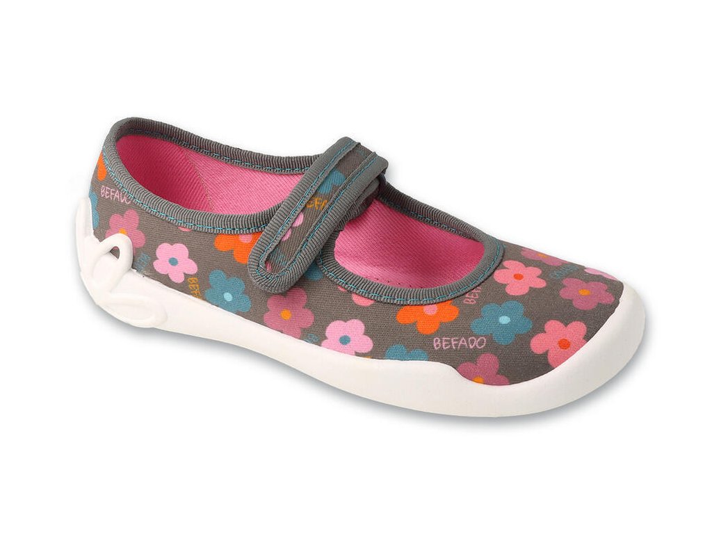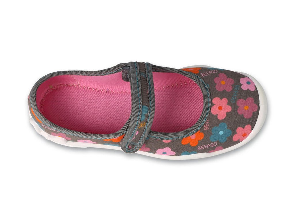 Dívčí balerínky Befado kytičky, zapínání na suchý zip. Pevná pata a pružná a prodyšná podrážka, SOFT-B systém - systém ochrany chodidel - vyměkčená stélka, poskytující zvýšené pohodlí při chůzi.