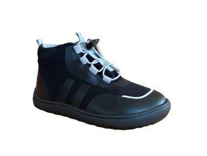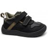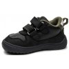 Chlapecké barefootové boty Protetika Olgers. Boty jsou vyrobeny v kombinaci hladké a broušen kůže v černé barvě s proužkem v khaki barvě. Zapínání na 2 suché zipy, uvnitř vyjímatelná kožená stélka bez podpory klenby. Boty mají nulový podpatek, dostatečně širokou špičku, jsou vhodné i pro dominantní palec, zpevněný opatek.