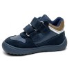 Chlapecké barefootové boty Protetika Veston. Boty jsou vyrobeny v kombinaci hladké a broušen kůže v modré barvě s hnědými proužky. Zapínání na 2 suché zipy, uvnitř vyjímatelná kožená stélka bez podpory klenby. Boty mají nulový podpatek, dostatečně širokou špičku, jsou vhodné i pro dominantní palec, zpevněný opatek.
