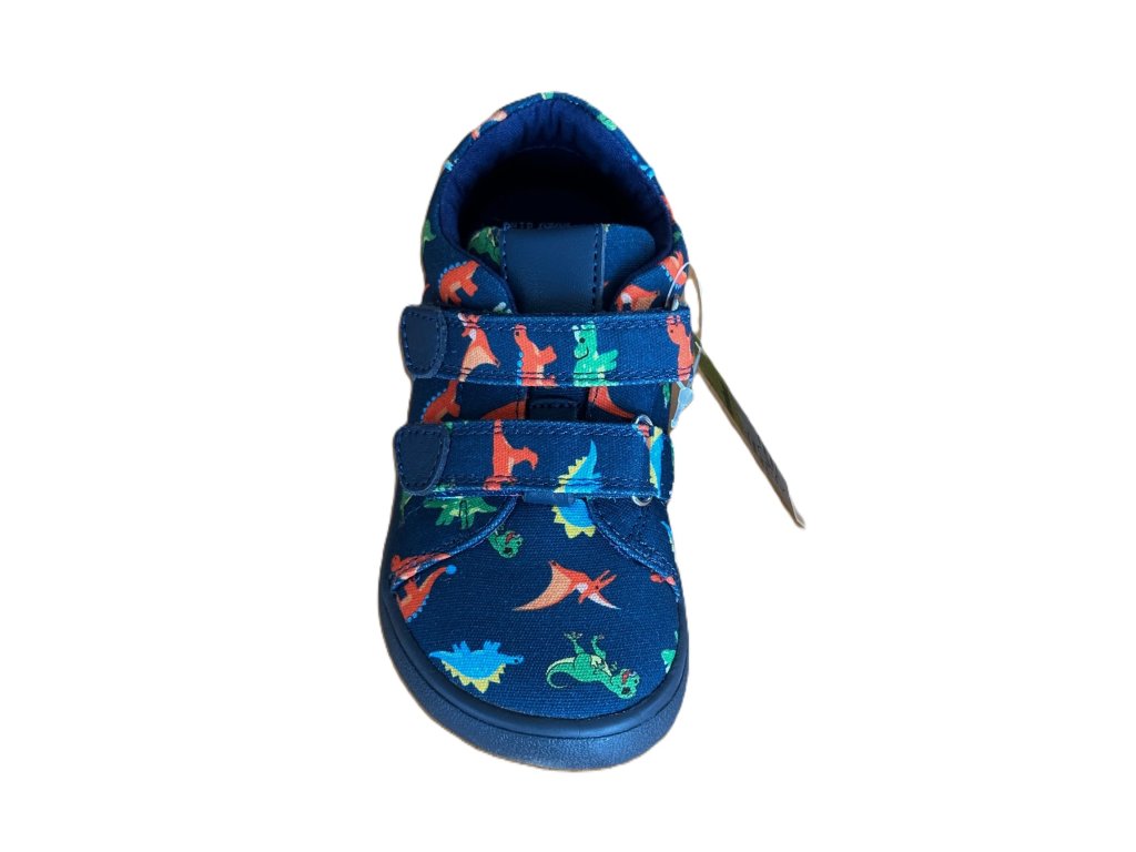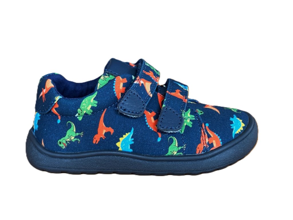Chlapecké barefootové tenisky Protetika Koro motiv dinosaurů. Boty jsou vyrobeny z kvalitního textilu. Zapínání na 2 suché zipy, uvnitř vyjímatelná stélka bez podpory klenby. Podešev má jemný protiskluzový dezén, je odolná, ale velmi ohebná. Boty mají nulový podpatek, dostatečně širokou špičku, jsou vhodné i pro dominantní palec, zpevněný opatek.