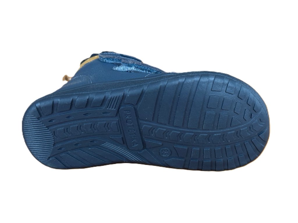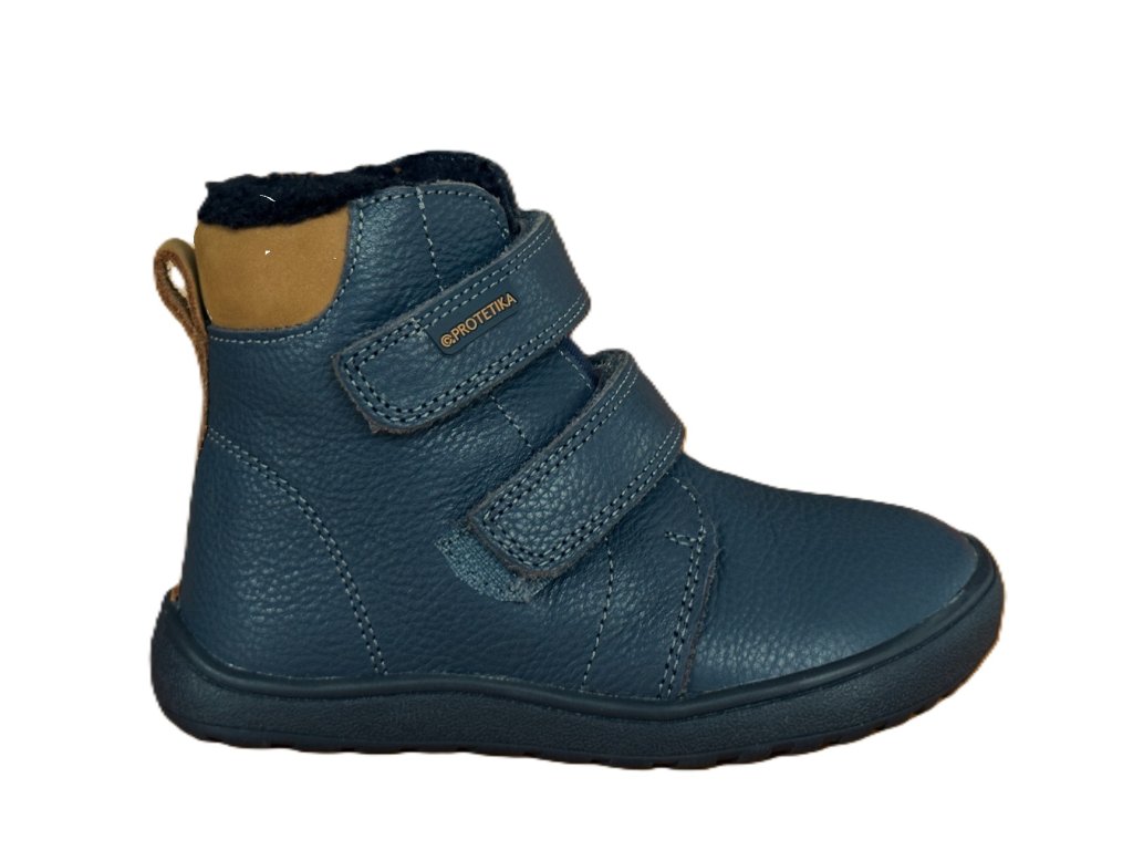 Chlapecké barefootové zimní boty Protetika Daryk denim s membránou Pro-tex. Boty jsou vyrobeny z hladké kůže, uvnitř zateplené kožíškem. Zapínání na 2 suché zipy, uvnitř vyjímatelná textilní stélka bez podpory klenby. Boty mají nulový podpatek, dostatečně širokou špičku, jsou vhodné i pro dominantní palec, zpevněný opatek.