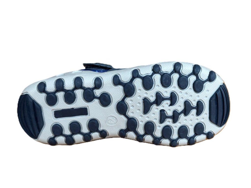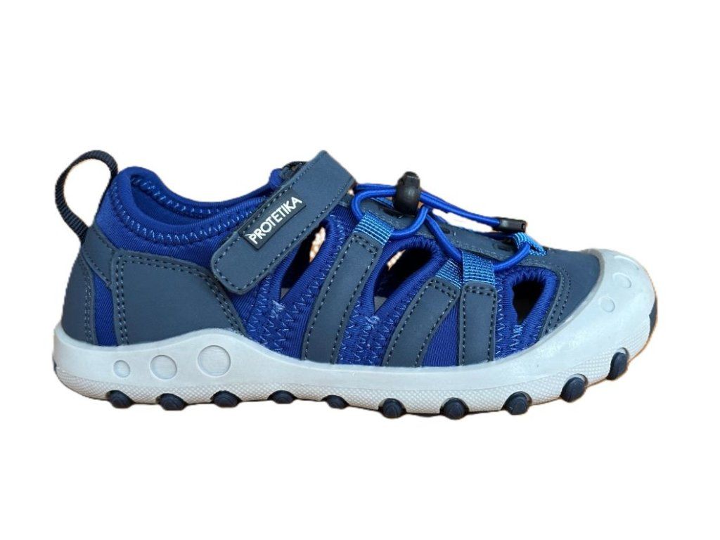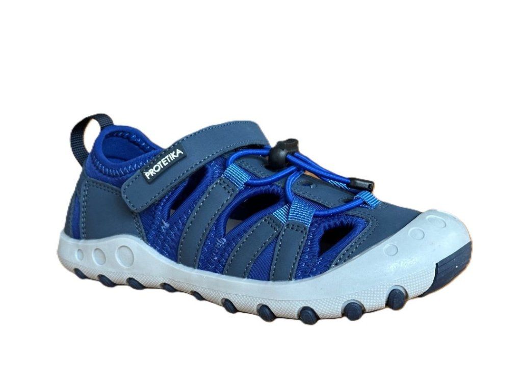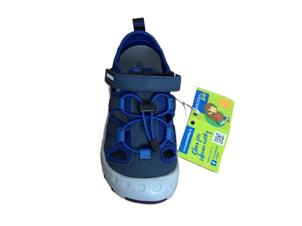 Chlapecké sandály Protetika Nio blue. Jedná se o kompromisní sandály, tedy mají dostatečně širokou špičku, boty jsou lehoučké. Zapínání na suchý zip, přes nárt možnost stáhnutí pomocí stahovací gumičky. Podešev je odolná a ohebná. Boty mají špičku proti okopu, pata jsou pouze minimálně zpevněná. Vyjímatelná textilní stélka, plus je navíc přidaná i stélka s podporou klenby.