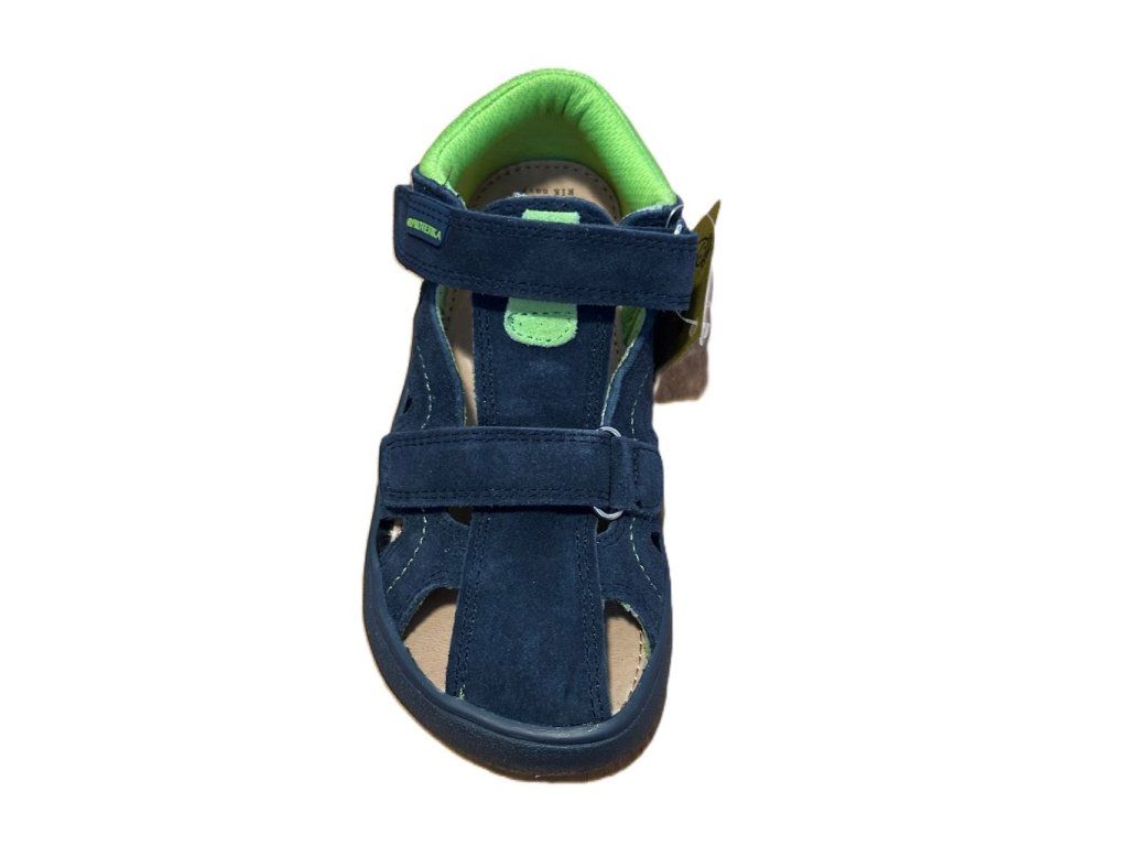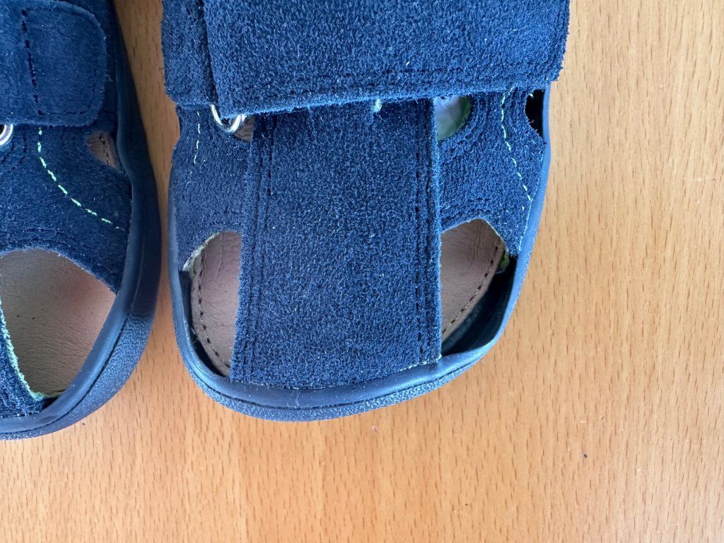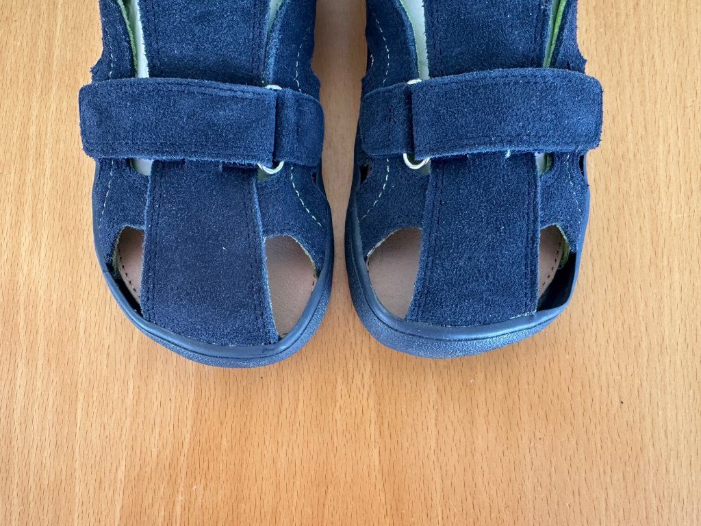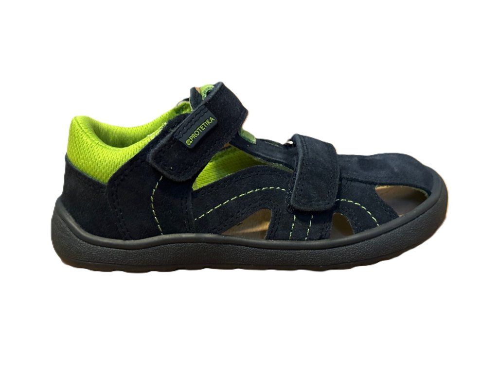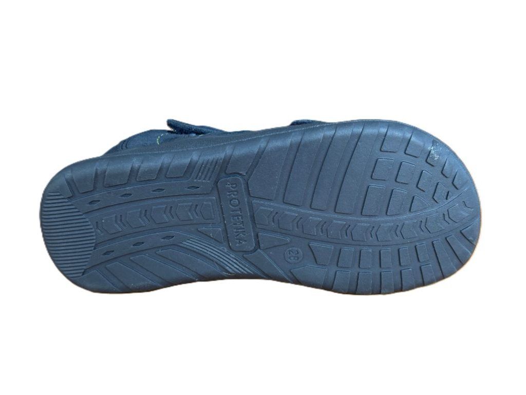 Chlapecké barefootové sandály Protetika Rik. Zapínání na 2 suché zipy, uvnitř vyjímatelná stélka bez podpory klenby. Podešev má jemný protiskluzový dezén, je odolná, ale velmi ohebná. Boty mají nulový podpatek, dostatečně širokou špičku, jsou vhodné i pro dominantní palec, zpevněný opatek.