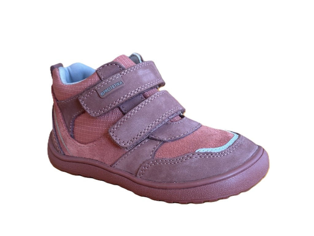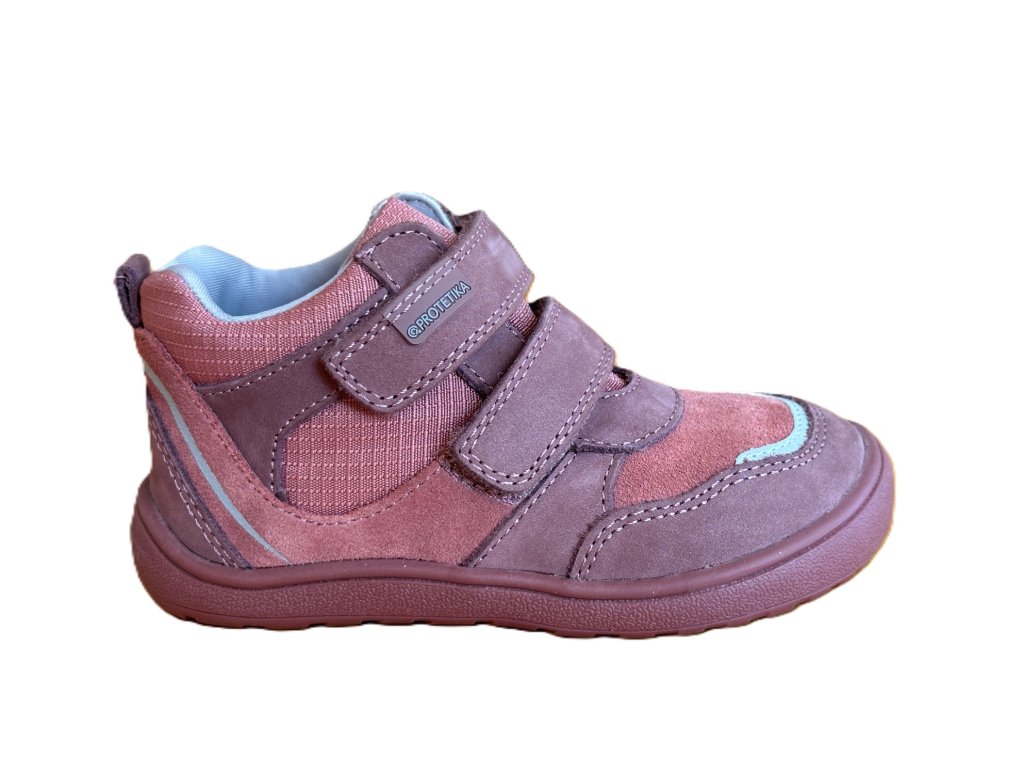 Dívčí kotníkové barefootové boty Protetika Banet s membránou. Boty jsou vyrobeny v kombinaci hladké a broušené kůže s textilem. Boty jsou opatřeny membránou, která zajišťuje odolnost proti vlhkosti, ale zároveň umožňuje nohám dýchat. Zapínání na 2 suché zipy, uvnitř vyjímatelná kožená stélka bez podpory klenby. Boty mají nulový podpatek, dostatečně širokou špičku, jsou vhodné i pro dominantní palec, zpevněný opatek, špička proti okopu.