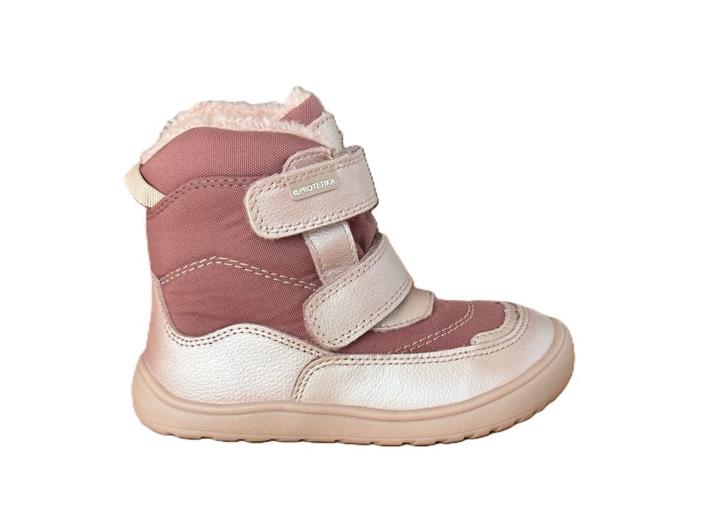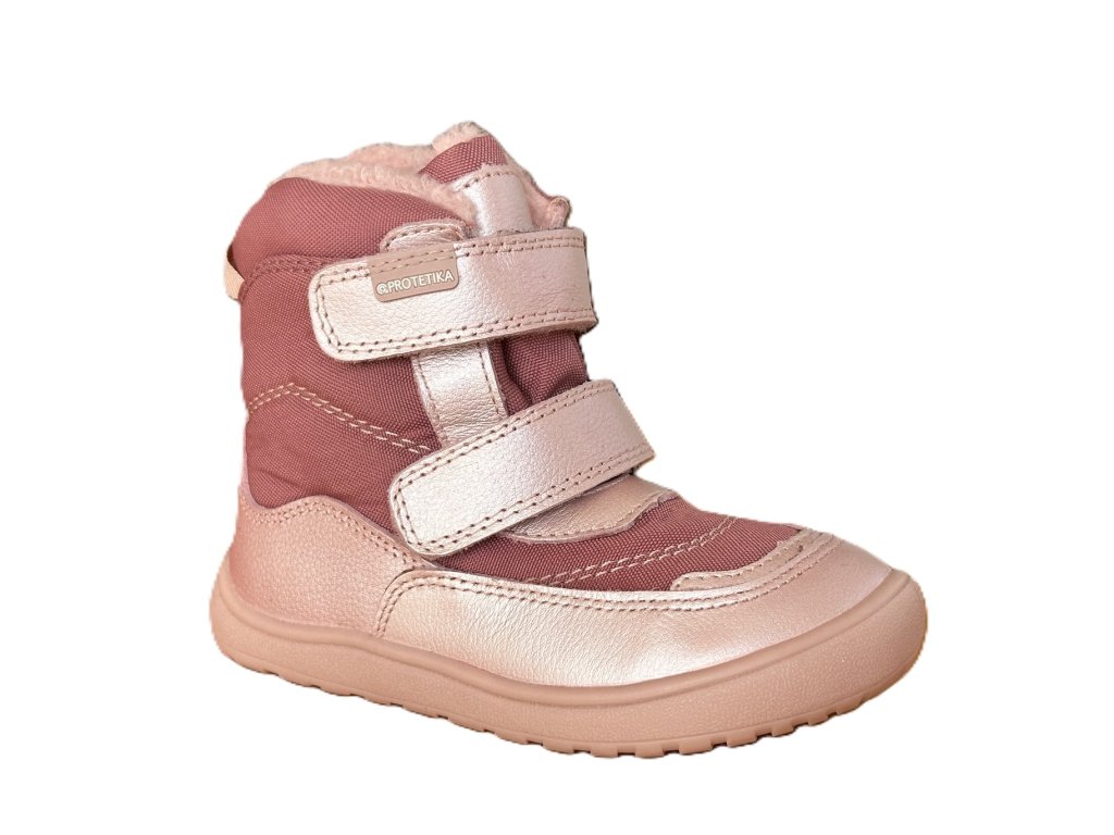 Dívčí barefootové zimní boty Protetika Nut pink s s membránou Pro-tex. Boty jsou vyššího střihu, jsou vyrobeny v kombinaci hladké kůže a textilu, uvnitř zateplené kožíškem. Zapínání na 2 suché zipy, uvnitř vyjímatelná textilní stélka bez podpory klenby. Boty mají nulový podpatek, dostatečně širokou špičku, jsou vhodné i pro dominantní palec, zpevněný opatek.