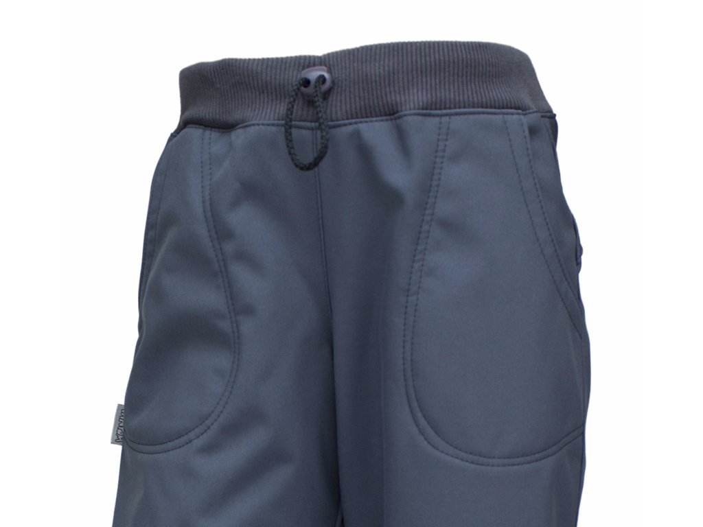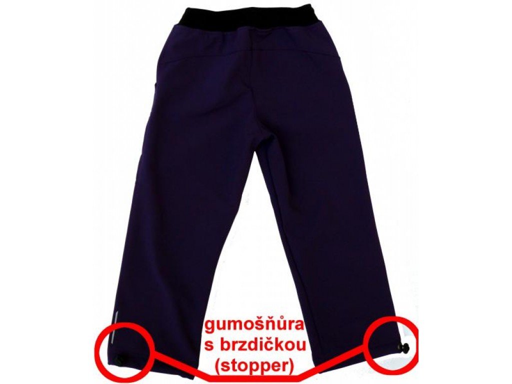 Dětské kalhoty SOFTSHELL do nápletu jsou vhodné na všední nošení i sportovní aktivity. Kalhoty jsou ušité z třívrstvého materiálu s membránou. Materiál je nepromokavý, větruodolný a prodyšný. Kalhoty jsou do gumy se šňůrou a brzdičkou. V délce lze nohavice stáhnout gumošňůrou s brzdičkou (stopperem). Na předních dílech jsou kapsy. Při nošení v zimě při nízkých venkovních teplotách výborně izolují a zároveň při nošení ve vyhřátých místnostech jsou prodyšné. Přesto je v zimě vhodné nosit pod kalhoty termoprádlo. V části bočních dílů je všita reflexní páska pro větší bezpečnost.