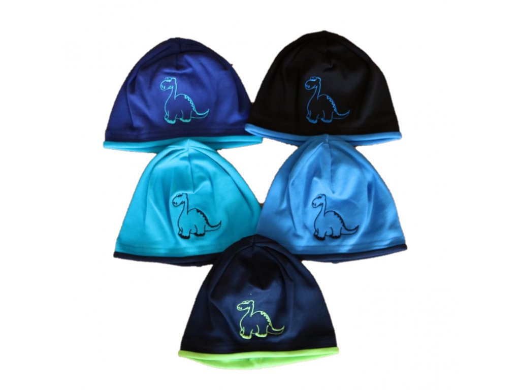 Krásná bavlněná čepice Pletex motiv dinosaurus, vykrojení přes uši.