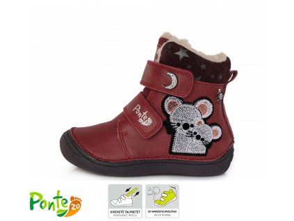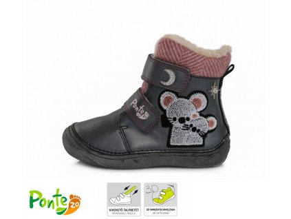 Zimní kožené kotníkové boty Ponte 20. Botky jsou vyrobeny z kvalitní kůže, zapínání na 2 suché zipy. Vyjímatelná anatomicky tvarovaná stélka a pevný opatek, pružná podrážka, kulatá špička. Uvnitř kožíšek. Boty jsou lehoučké, krásně ohebné. Obuv se supinací - podrážka je nakloněna tak, aby pomáhala udržet nohu ve správné poloze.