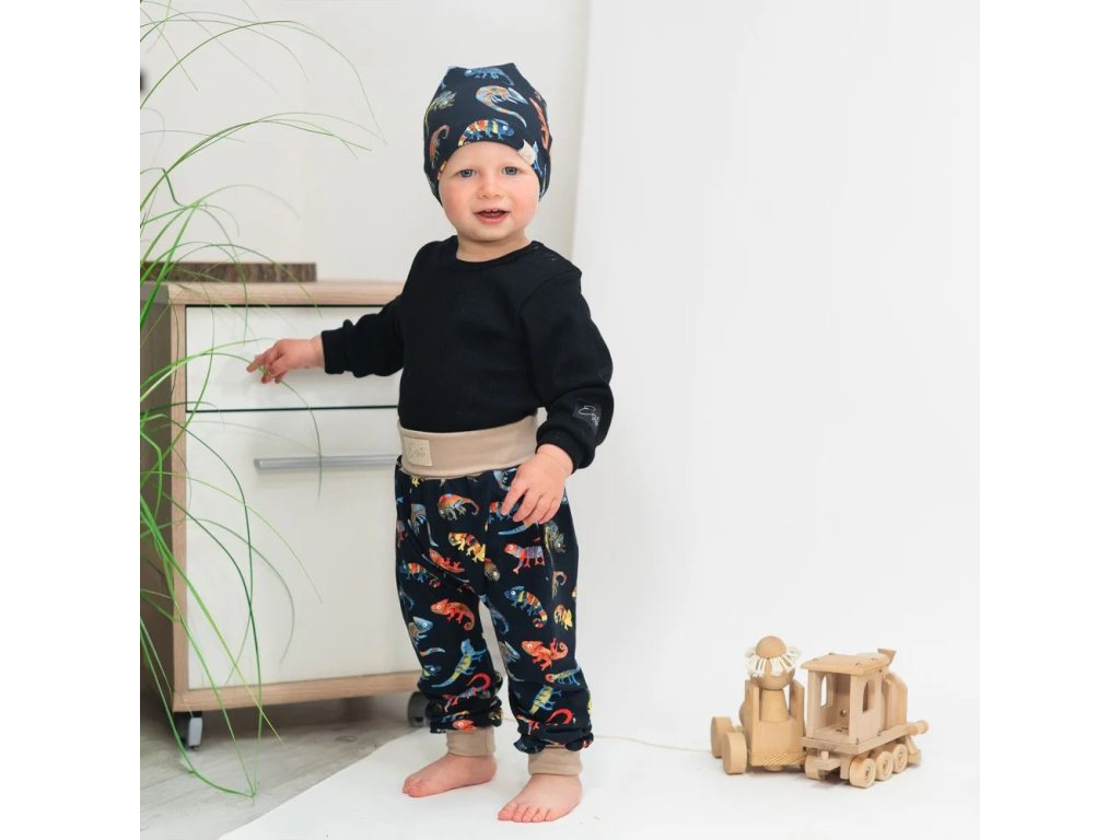 Rostoucí dětské tepláky Chameleon jsou pružné dětské tepláky osvědčeného střihu s vysokým bavlněným nápletem v pase. Chlapecké tepláky parkour / baggy mají na spodní části u nohavic vyšší náplet, který perfektně drží na obuvi nebo kolem nohy a hlavně prodlouží tepláky o jednu až dvě velikosti.